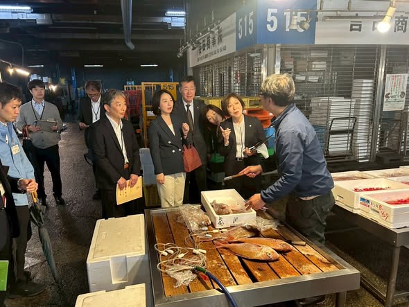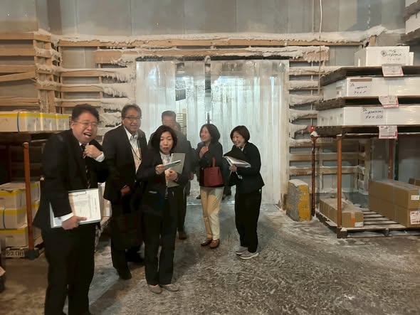 昭和53年より茨木市に開設され築48年となる施設で、水産卸売場、マイナス25℃、マイナス50℃の冷凍庫内、バナナ加工施設を視察しました。中東情勢の影響を受け、発泡スチロールやエチレンガスの不足など、「金額も跳ね上がるし、何とかしてもらいたい」という不安もお聞きしました。
